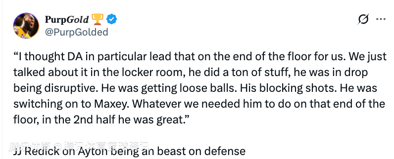 谈到艾顿,雷迪克表示:“我觉得他在防守端扛起了重任。我们刚在更衣室里还聊这事呢,他今晚干了太多脏活,沉退防守时持续干扰对手、拼抢地板球、封盖投篮,还换防去对位马克西。下半场防守端我们需要他做什么,他都完美做到了。”此役艾顿拿到14分12篮板。