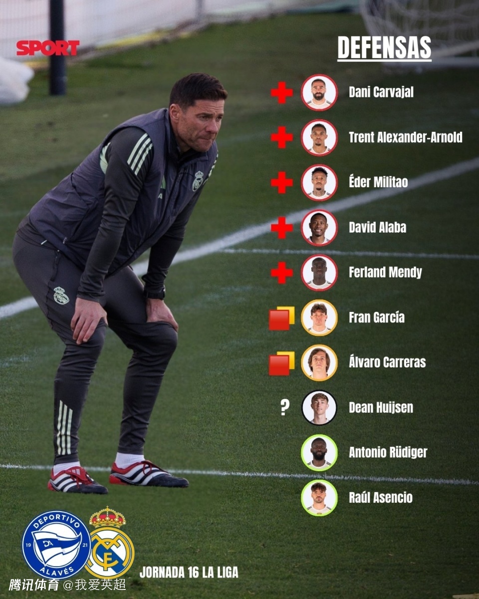 更令阿隆索无奈的是,皇马后防线本赛季遭遇严重伤病,包括米利唐在内,目前已有6人受伤:卡瓦哈尔(右膝关节镜手术)、阿诺德(左股四头肌前直肌撕裂)、赫伊森(膝盖不适)、阿拉巴(右小腿比目鱼肌不适)、门迪、米利唐。
