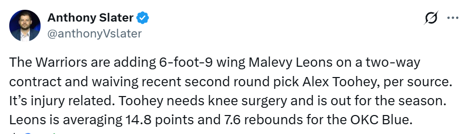 2025-12-09 04:30北京时间12月9日,勇士队记Slater报道,消息人士透露,勇士队将签下身高2米06的侧翼球员马莱维-莱昂斯,合同为双向合同,同时裁掉今年的52号秀亚历克斯-图希。据悉,裁员与伤病有关,图希需要接受膝盖手术,赛季报销。莱昂斯目前效力于G联赛的俄克拉荷马城蓝队,场均贡献14.8分和7.6篮板。