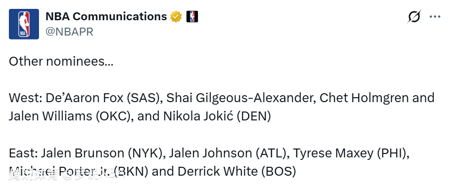 2025-12-09 05:00北京时间12月9日,NBA官方公布了第7周的周最佳球员。掘金球星贾马尔-穆雷当选西部周最佳球员,这是穆雷生涯首次当选周最佳球员。东部周最佳的奖项属于凯尔特人的杰伦-布朗,这是布朗生涯第5次当选周最佳,也是本赛季首次当选。亚历山大、约基奇等球星获得提名。