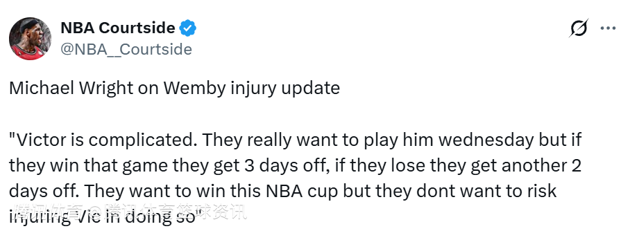 Michael Wright表示:“文班亚马的情况比较复杂。球队确实很希望他能出战对阵鹈鹕的比赛,但如果球队赢下这场球,就能迎来3天的休整期;要是输了,也能再多休息2天。他们既想拿下这座NBA杯冠军,又不愿为了争冠而让文班亚马承担受伤的风险。”