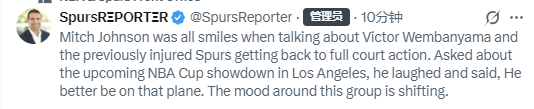 在谈到文班亚马能否出战与湖人队的NBA杯比赛时(比赛将在本周四进行),约翰逊调侃道:“他肯定是要坐那趟飞机过去的,现在他最好已经在飞机上了。”