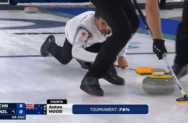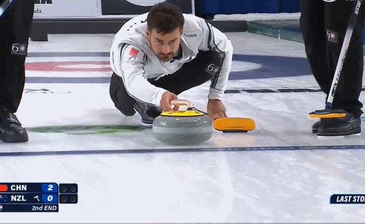 第二局:徐晓明两投实现了2分牵制,新西兰最多只能拿1分的情况下,胡德最后一投溜壶,中国偷到2分,以4-0扩大优势。