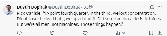 在谈到球队关键时刻的表现时,卡莱尔说道:“其实第三节的时候,我们专注力有所下降,虽然没丢领先优势,但分差被大幅缩小了,还出现了一些平时不会有的失误。不过我们都是普通人,不是机器,这种情况在所难免。到了第四节,我们找到了扭转局势的办法,真的要好好表扬球队的小伙子们。对手也是支进攻爆发力很强的队伍,即便落后也始终没放弃,也得给他们肯定。另外内姆布哈德的表现太惊艳了,砍下了28分,这绝对是一场顶级水准的比赛。队里其他球员也都打得不错,我们会把注意力放在积极的方面,也就是第四节那次成功的局势扭转。”