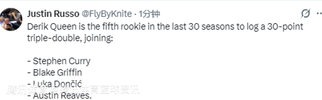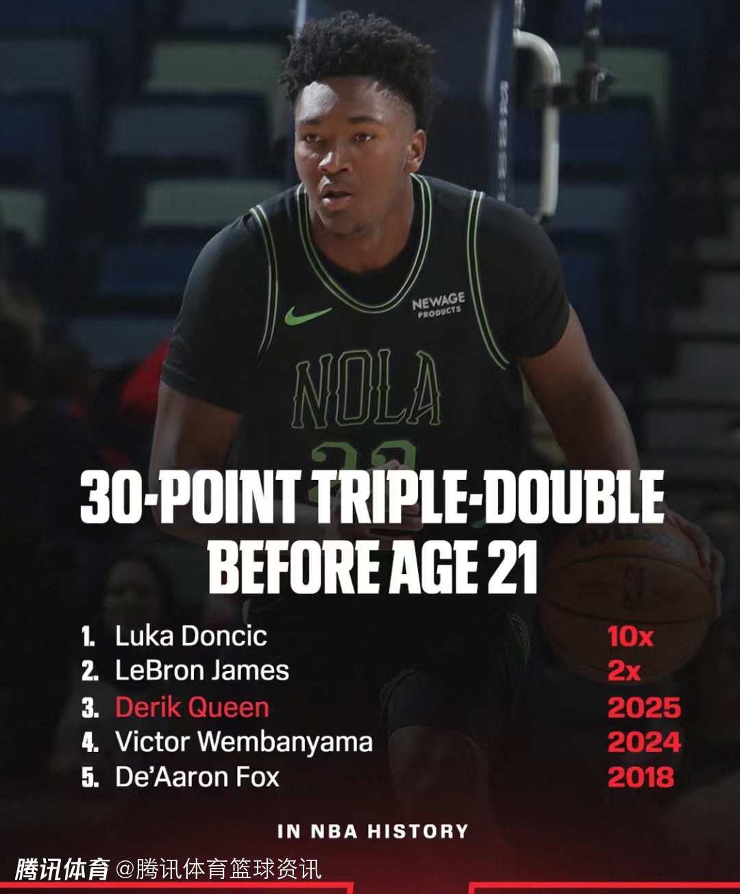 在NBA历史上得到30+三双的21岁以下球员排行榜中,德里克-奎因也赫然在列。东契奇10次,詹姆斯2次,文班亚马和福克斯分别在2024和2018年达成此成就。