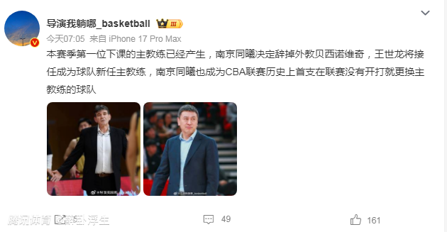 2025-12-09 12:20北京时间12月9日,2025-26赛季的CBA新赛季尚未开始,如今根据国内媒体与媒体人报道,因为在CBA俱乐部杯表现不佳与难以有效调整,同曦男篮洋帅贝西洛维奇将被辞掉,前浙江男篮获得过最佳主教练奖的王世龙将接任成为主教练,同曦男篮成为CBA历史首支在新赛季尚未开始就换帅的球队。