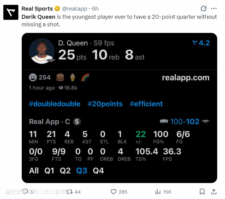 这场比赛奎因一战创造多项纪录:1.他第三节单节21分,成为NBA历史上最年轻单节20+且命中率100%的球员;