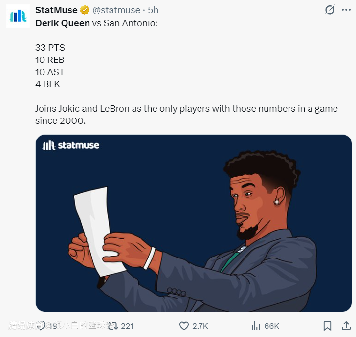 6.奎因是自2000年以来,詹姆斯、约基奇后首位达成以上数据的球员;