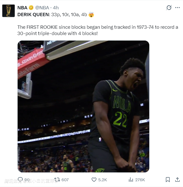 5.奎因是自1973-74赛季以来首位拿到30+三双+4盖帽的新秀;