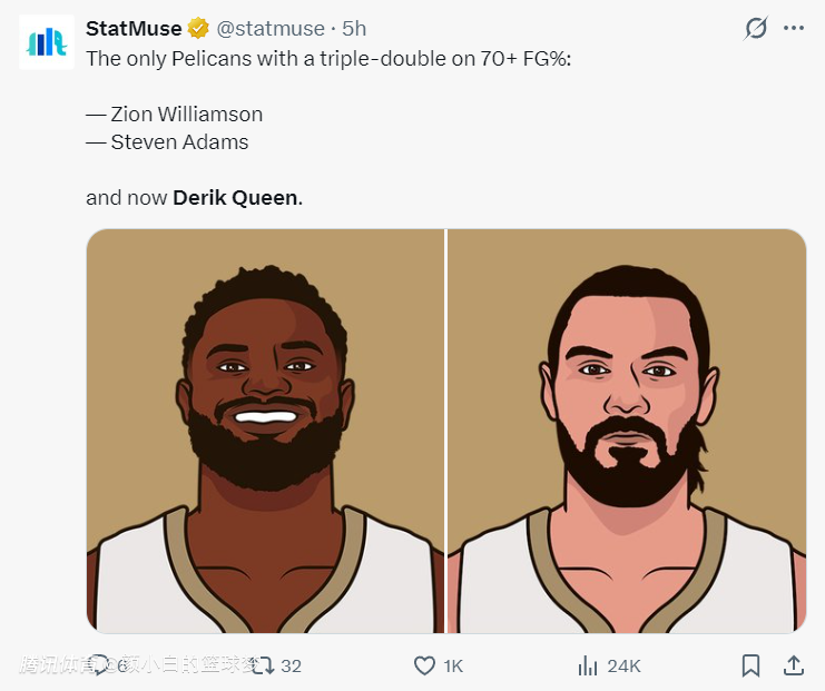 7.奎因是鹈鹕队史拿得到三双+命中率超70%第三人,比肩锡安、亚当斯;