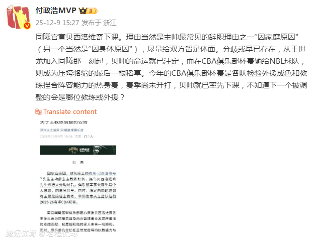 “同曦官宣贝西洛维奇下课。理由当然是主帅最常见的辞职理由之一‘因家庭原因’(另一个当然是‘因身体原因’),尽量给双方留足体面。分歧或早已存在,从王世龙加入同曦那一刻起,贝帅的命运就已注定,而在CBA俱乐部杯赛输给NBL球队,则成为压垮骆驼的最后一根稻草。”该媒体人说。