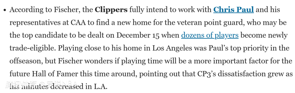 Fischer表示,快船方面计划全力配合保罗及其在CAA经纪公司的团队,为这位老将控卫寻找新东家。6天后,也就是北京时间12月16日,将有数十名球员解锁交易资格,保罗预计会成为届时头号被交易人选。