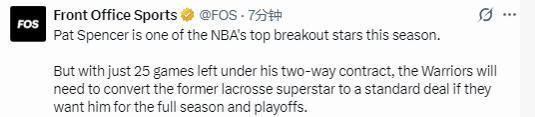 2025-12-10 09:30北京时间12月10日,根据Front Office Sports报道,勇士队预计会选择转正斯宾塞的双向合同,但相关操作可能需要等到1月15日之后。