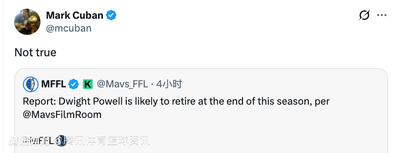 2025-12-10 11:10北京时间12月10日,此前独行侠媒体Mavs Film Room曾报道,德怀特-鲍威尔很可能会在本赛季结束后退役,对此,库班在线辟谣,转发此报道写道:“不是真的。”