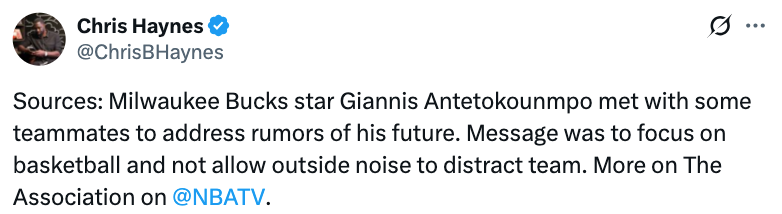 Haynes表示:“目前关于字母哥未来去向的流言正甚嚣尘上。据我掌握的消息源透露,字母哥近期已和部分队友进行了沟通,着重强调了专注篮球的重要性,呼吁大家凝心聚力,不要让场外干扰影响到当下的备战进程。”