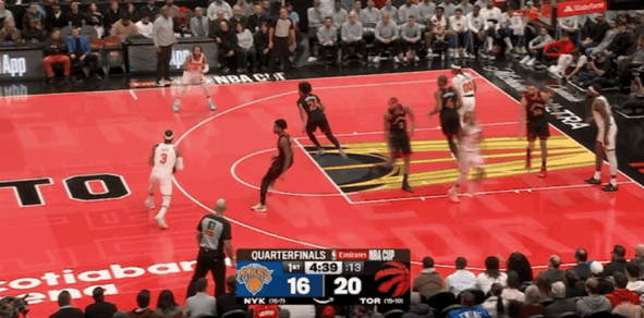 布伦森遭遇对手包夹,但这也给到尼克斯更多空位得分机会,猛龙眼看难以追分,直接在最后2分05秒主动犯规,在死球情况下换下主力球员,比赛进入垃圾时间,最终尼克斯轻取击败猛龙挺进杯赛四强。