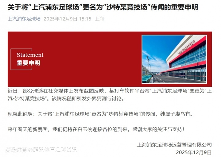 对此,球场方面明确表示,将“上汽浦东足球场”更名为“沙特某竞技场”的说法纯属捏造,与事实完全不符。