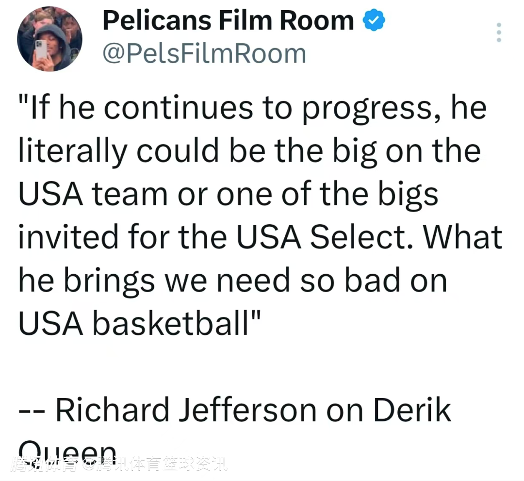 杰弗森力挺鹈鹕新秀奎因:如果他持续进步 能成为美国男篮内线支柱
