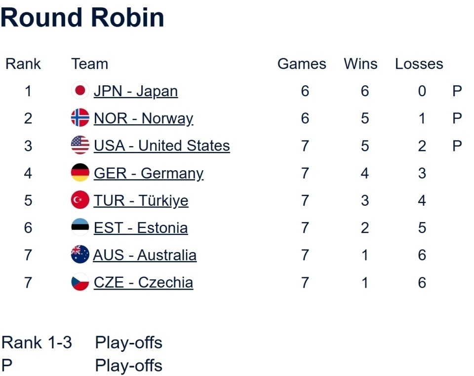 吉村纱也香率领的日本队,在第五轮也以全胜战绩率先晋级;挪威-诺尔维克队在第六轮后,拿到第二个席位赛资格。