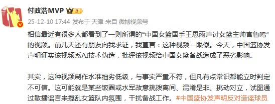 2025-12-10 18:40北京时间12月20日,中国篮协发布严正声明,针对中国女篮教练员和运动员的不实信息与恶意谣言,甚至利用AI技术伪造音视频,侵权造假、进行人身侮辱、散布虚假信息,挑动对立赚取流量。