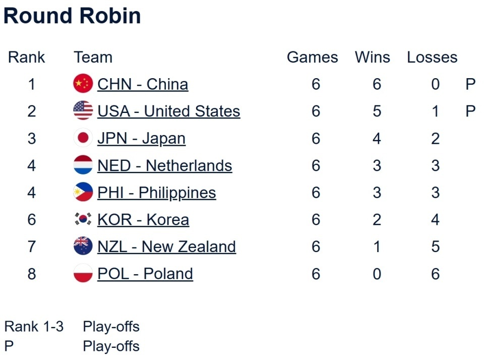 已经结束的前六轮比拼里,中国队凭借五连胜率先拿到出线资格;而在上午进行的第六轮里,以7-0大胜波兰之后;中国队靠着循环赛第二轮9-8险胜美国;循环赛第一轮美国5-2完胜日本这两层胜负关系压制,无论最后一轮中/美各自胜负如何,前二排名都不会发生改变。