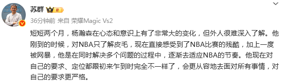 苏群表示:“短短两个月,杨瀚森在心态和意识上有了非常大的变化,但外人很难深入了解。他刚到的时候,对NBA只了解皮毛,现在直接感受到了NBA比赛的残酷,加上一度被网暴,他是在同时解决多个问题的过程中,逐渐去适应NBA的节奏。他现在对自己的要求、定位都跟初来乍到时完全不一样了,会更从容地去面对所有事情,对自己的要求更严格。