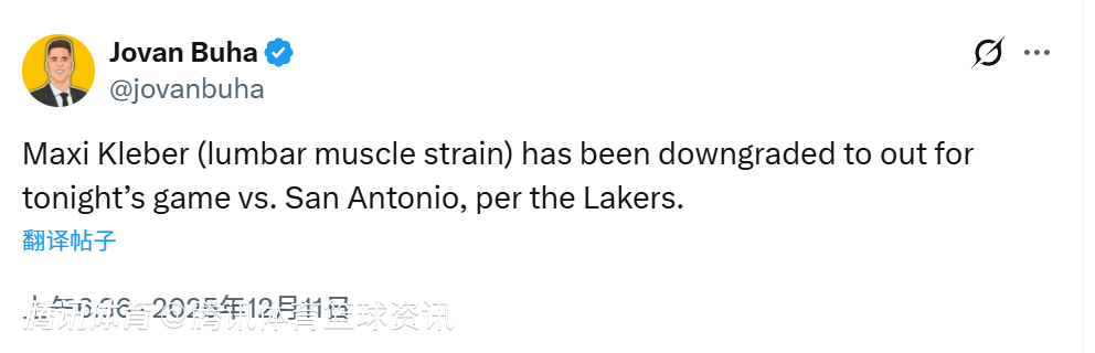 2025-12-11 06:50北京时间12月11日,NBA杯赛1/4决赛继续进行,湖人对阵马刺。赛前,湖人方面更新球队本场伤情,此前因腰肌拉伤被列为出战成疑的克勒贝尔被降级为确定缺阵,将无缘本场比赛。