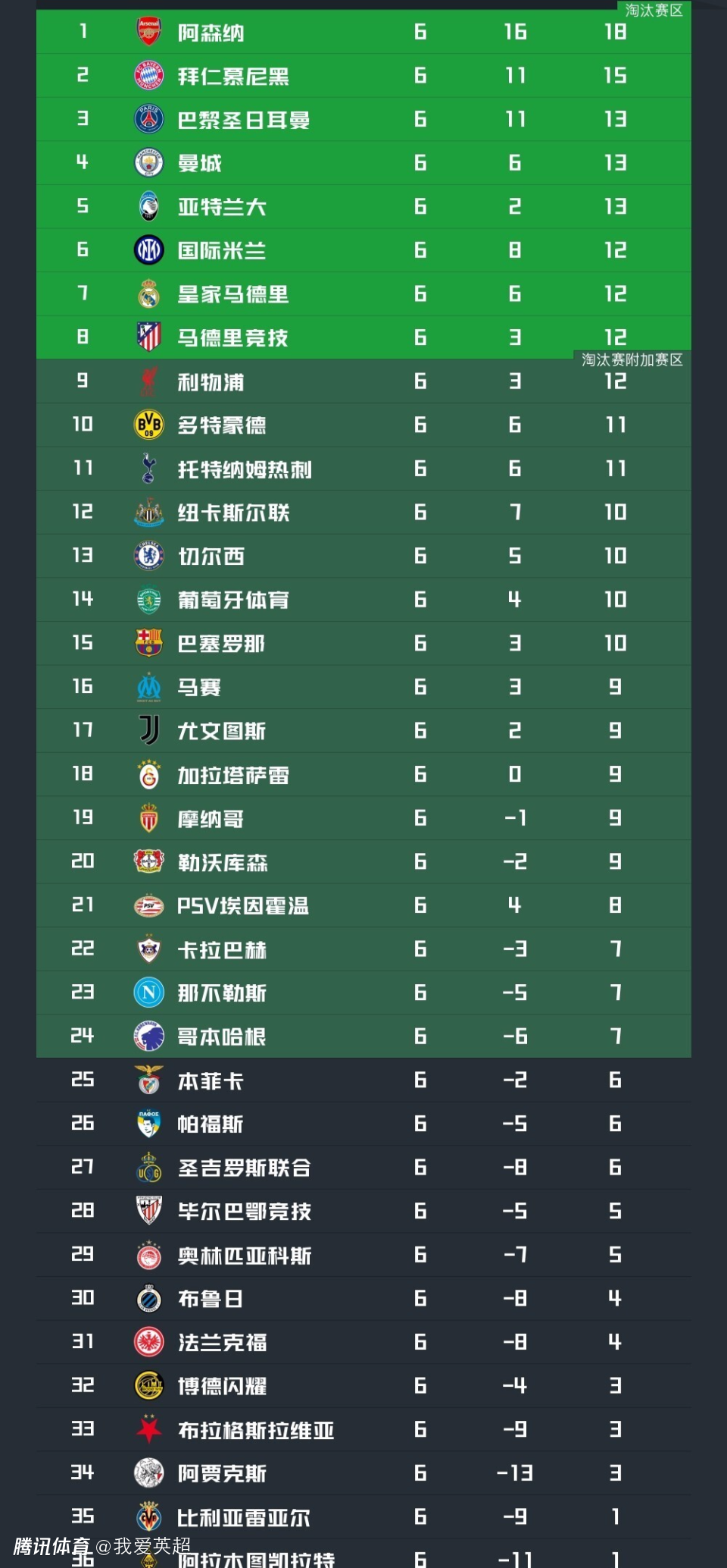欧冠最新形势:阿森纳基本锁定前8!4队6轮后仍0胜 西甲第3名排倒2