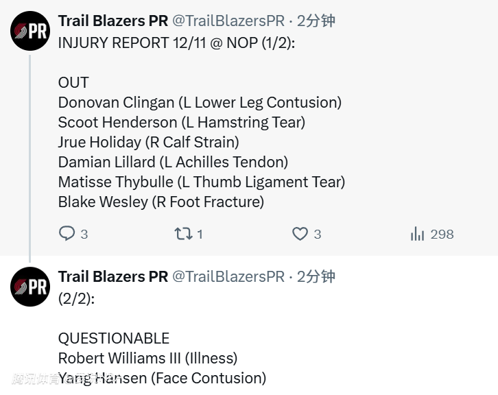 2025-12-11 07:10北京时间12月11日,开拓者官方更新了明日对阵鹈鹕的伤病报告,杨瀚森因面部挫伤被列为出战成疑(上场可能50%)。