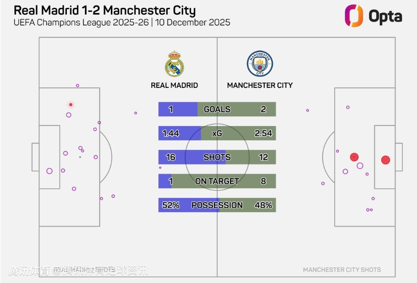 比赛数据显示,皇马全场共16次尝试射门,却只有一次命中目标;曼城则在12脚射门中完成8次射正,并取得2粒进球。