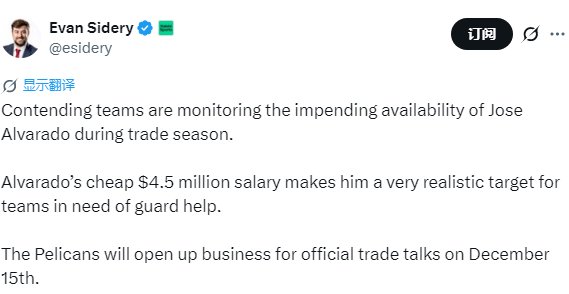 2025-12-11 08:50北京时间12月11日,根据记者Evan Sidery的报道,多支冲冠球队正密切关注何塞-阿尔瓦拉多在交易窗口期的潜在动向,这位后卫即将进入可交易名单。