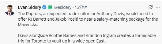 该记者写道:“猛龙队作为安东尼-戴维斯的潜在交易追求方,需要送出RJ-巴雷特与雅各布-珀尔特尔,才能凑成一份接近匹配独行侠队薪资的交易方案。若戴维斯能与斯科蒂-巴恩斯、布兰登-英格拉姆联手,将为多伦多打造一套极具威慑力的三巨头阵容,助力球队在竞争开放的东部赛区实现排名跃升。”