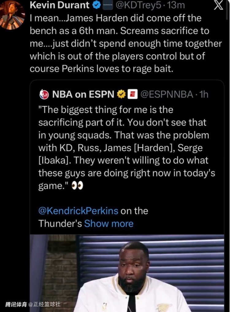 对于帕金斯的言论,杜兰特转推评论道:“我的意思是,哈登作为第六人替补出场,这对我来说就是一种牺牲。只是我们在一起的时间不够长,这不是球员能够控制的,但是帕金斯显然喜欢用这种话题来挑起争论。”