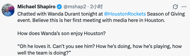 被问及杜兰特在休斯顿过得怎么样,旺达表示:“他超喜欢这儿的。你没看到吗?他的状态、他的比赛表现,还有球队的成绩,都说明一切了啊。过去有朋友住在这里时我来过,但这次我渴望真正走进这座城市。”