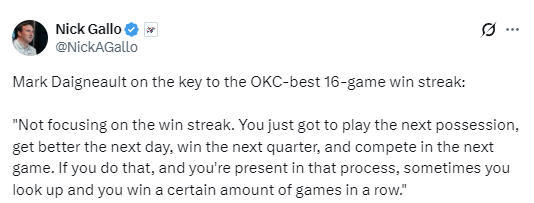 在谈到雷霆队24胜1负的梦幻开局时,戴格诺特说道:“这样的成绩固然亮眼,但到了下一场比赛,一切过往的战绩都将归零。我们从不去纠结连胜纪录。你要做的就是专注下一个回合,在第二天变得更强,赢下下一节比赛,全力拼好下一场对决。只要你全身心投入到这个过程中,有时抬头一看,就会发现自己已经不知不觉地收获了一波连胜。