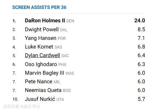 如今根据NBA官网数据显示,杨瀚森本赛季每36分钟的掩护助攻次数,竟然达到7.1次高居联盟第三,仅次于掘金球员霍姆斯和独行侠球员鲍威尔。