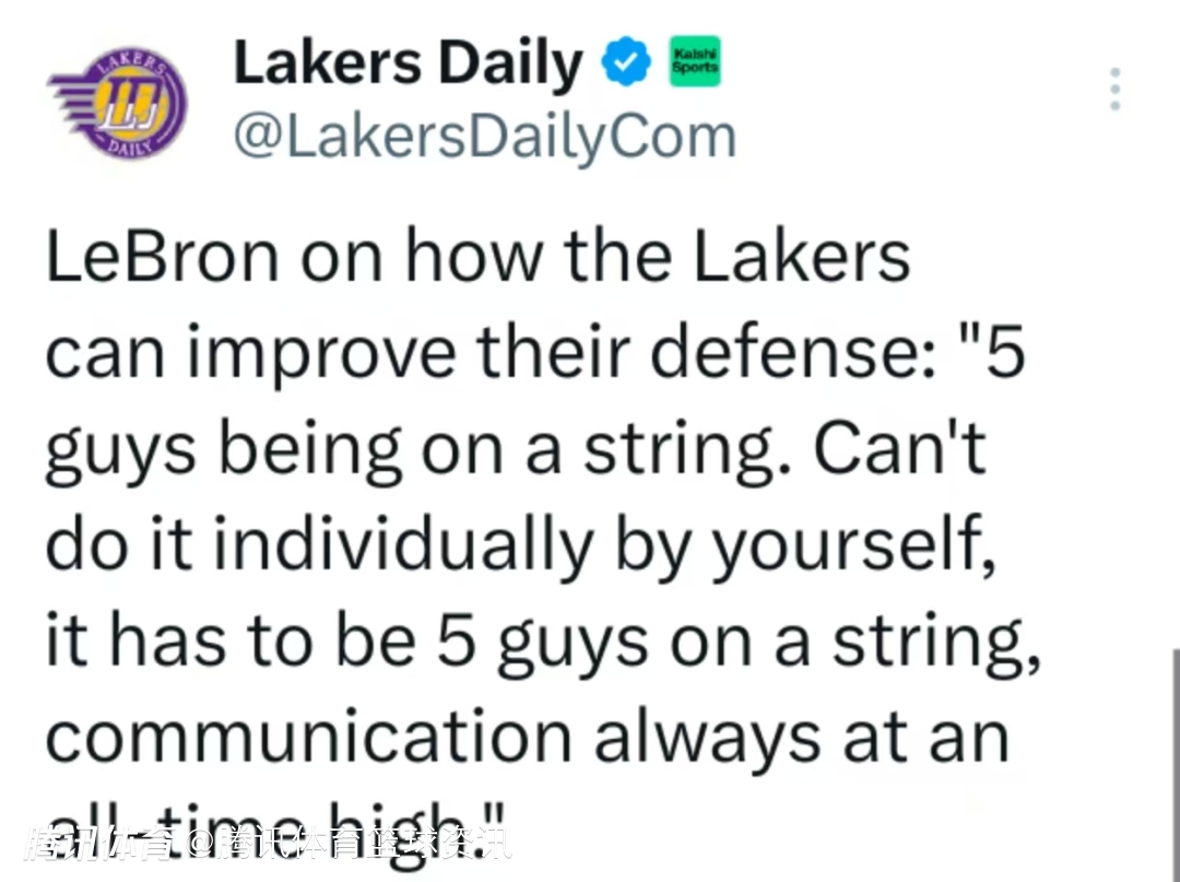詹姆斯在谈到湖人如何提升防守时表示:“全队必须像一根绳上的蚂蚱,步调一致。靠单打独斗根本不行,得五个人拧成一股劲,沟通必须时刻拉满。”