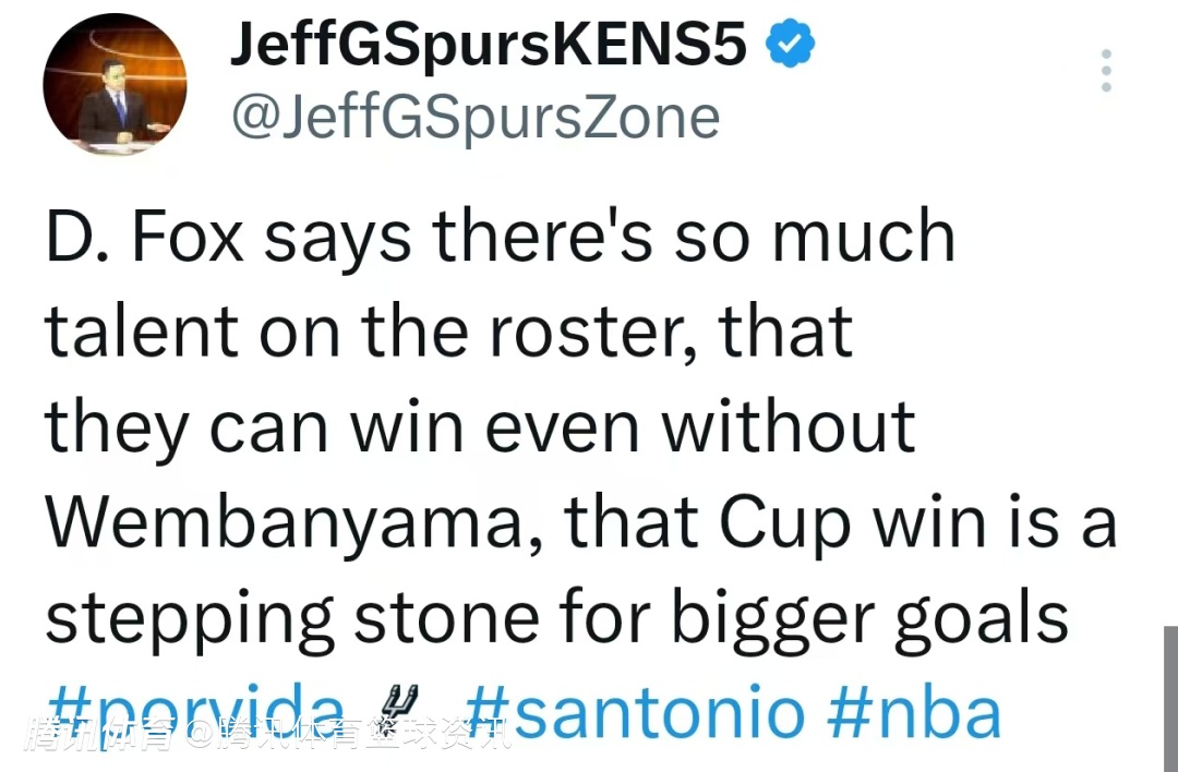 福克斯:百分之百是。就算没有文班亚马,我们的天赋也足够应对任何比赛——你能看到更衣室里的天赋有多深厚。我早就坚信我们能打这样的硬仗,这场胜利只是一块垫脚石。我们当然想赢杯赛,但最终目标是NBA总冠军。我们必须一步步积累,这样的硬仗正是成长的必经之路。