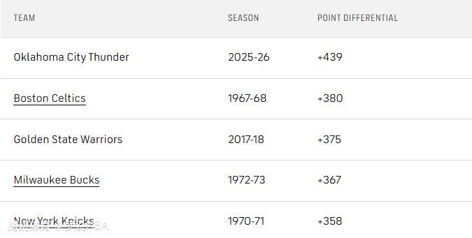说到疯狂的数据,雷霆本赛季至今的总净胜分已高达439分,以近乎悬殊的优势刷新了NBA历史前25场比赛的净胜分纪录(原纪录是1967-68赛季凯尔特人的380分)。上赛季,雷霆每百回合净胜分12.9分,已是历史最佳;而本赛季25场战罢,他们将这一纪录大幅提升至恐怖的+17.5分。