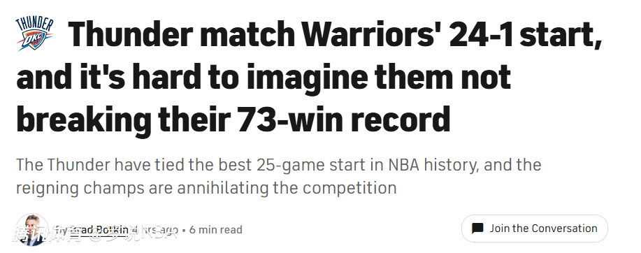 2025-12-11 19:50北京时间12月11日,雷霆在NBA杯赛上以49分优势狂胜太阳,24胜1负的战绩追平了NBA历史最佳的25场开局战绩,卫冕冠军正以摧枯拉朽之势横扫联盟诸强。CBS名记Botkin从数据角度解读了雷霆的强大,并相信本赛季的雷霆注定会打破勇士73胜的常规赛纪录,以下是他的文章内容——