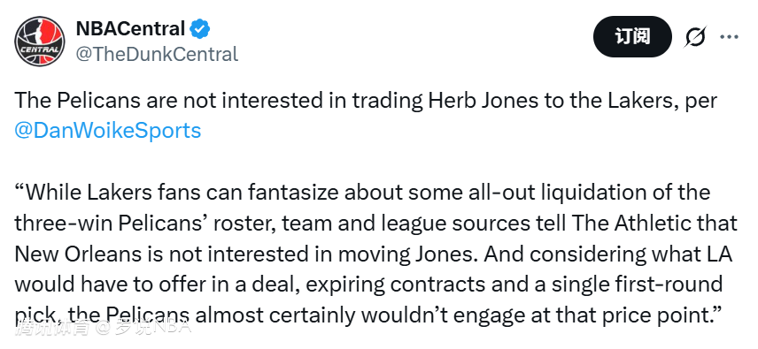 或许在明年2月6日的NBA交易截止日前,湖人的筹码价值会发生变化,或者鹈鹕队对琼斯的定位会有所调整,但就目前而言,消息人士指出,鹈鹕队需要极其丰厚的报价,才会考虑放走琼斯。
