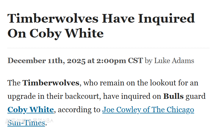 2025-12-12 05:40北京时间12月12日,据《芝加哥太阳时报》记者乔-考利报道,仍在寻求后场补强的森林狼队,已就公牛队后卫科比-怀特的交易可能性进行询价。