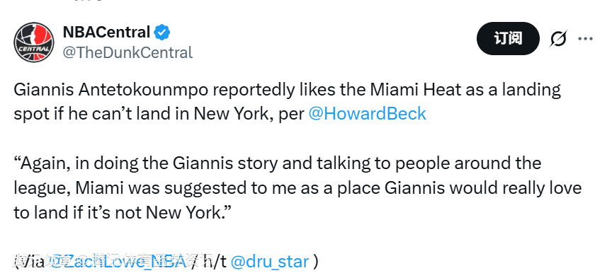 Howard Beck表示:“在撰写关于字母哥的报道、与联盟多位圈内人士交流的过程中,我得到的说法是:如果尼克斯这条路走不通,热火会是他非常向往的去处。”