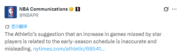 “John Hollinger还声称,联盟出现赛季初软组织伤病增多的趋势,且联盟在保障球星健康方面做得越来越差。但数据显示,本赛季前六周,导致球星缺阵的伤病案例数量,创下过去六个赛季的最低纪录,较去年同期下降超25%。尽管有部分球星因上赛季遗留伤病缺席本赛季比赛,但将本赛季球星缺阵场次的任何增加,都归咎于赛季前六周赛程的说法,显然是具有误导性的。”