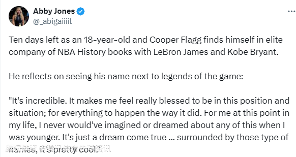 2025-12-12 06:30北京时间12月12日,独行侠状元弗拉格在球队训练结束后接受了媒体采访。谈及与詹姆斯、科比等传奇球星并列一事。