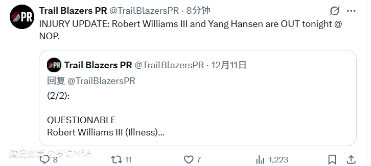 2025-12-12 08:00北京时间12月12日,开拓者官方更新今日对阵鹈鹕的伤病名单,杨瀚森(面部挫伤)和罗威(生病)均被列为缺阵,算上之前已经缺阵的克林根(左腿挫伤),开拓者三位中锋都高挂免战牌,全队唯一能上场的中锋是杜普-里斯。