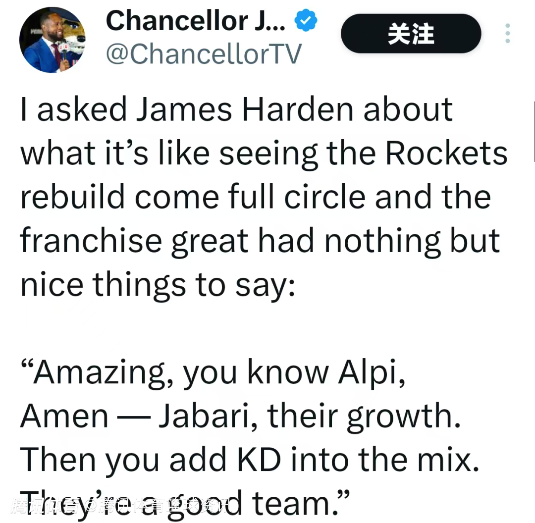 认可满满!哈登谈火箭蜕变:新星成长亮眼 杜兰特到来让球队实力跃升