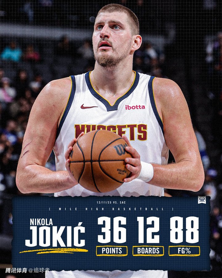 2025-12-12 15:50北京时间12月12日,NBA常规赛掘金136-105大胜国王31分,约基奇又打出超级统治力,全场出战29分钟,16投14中狂砍36分12篮板8助攻2抢断,正负值+26;约基奇首节7中6拿到16分,第三节7中6拿到13分,带队早早打爆国王,三节打卡下班太轻松。