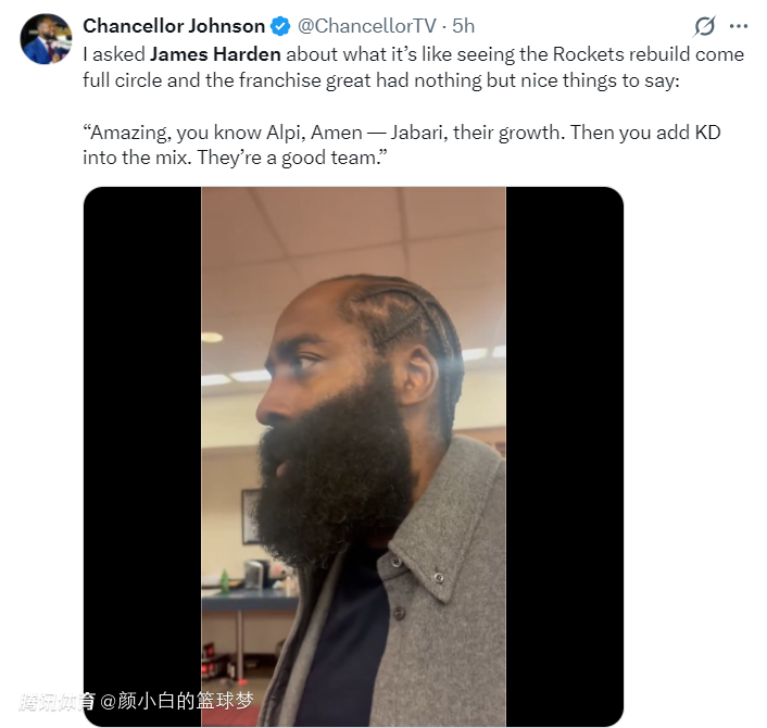 赛后哈登接受采访谈到这支全新的休斯顿火箭队:太棒了他们,你知道的,他们有阿尔佩伦(申京)、阿门、小贾巴里,这些年轻人成长的很快,然后杜兰特也被加起来了,他们已经是一支非常棒的球队。