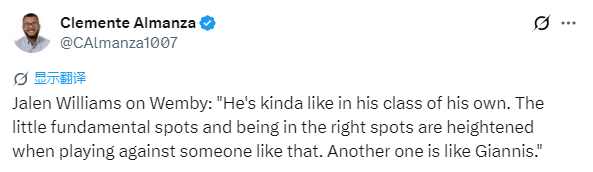 而提到马刺球星文班亚马时,杰伦-威廉姆斯给出了极高评价:“他完全是独一档的存在。对位他这样的球员时,你对基本功的打磨、对跑位时机的把握,都得做到极致才行。在这一点上,能和他相提并论的球员,也就字母哥了。”